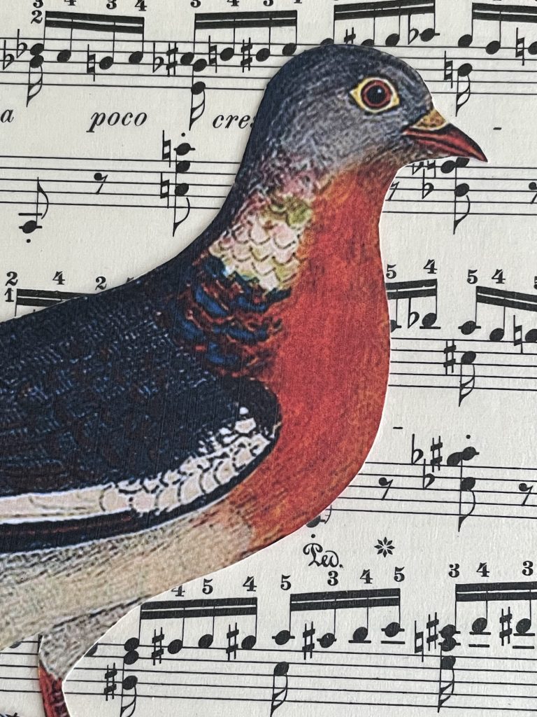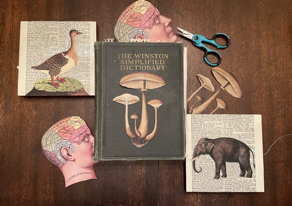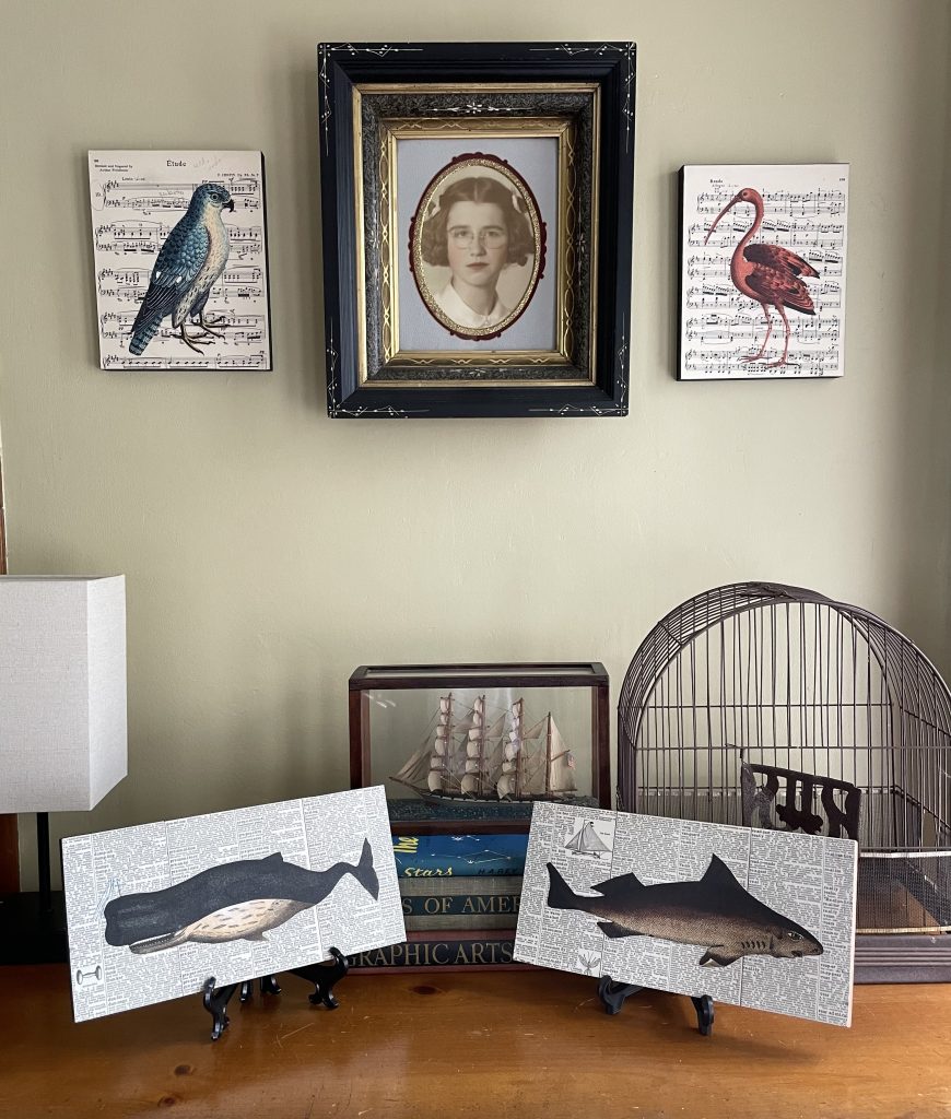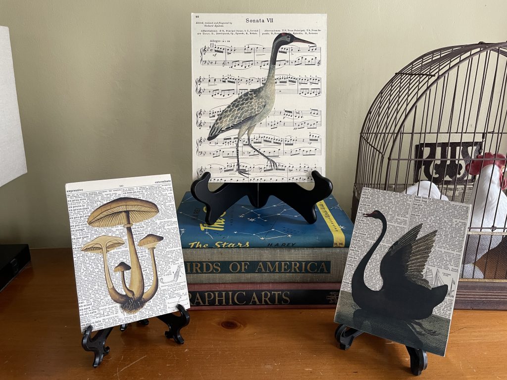 LOCATION: The Eliot School, 24 Eliot Street Mixed media collage aritst inspired by all things vintage. Each collage is unique and made with original sheet music, pages from dictionaries-encyclopedias, and images from clipart and vintage nature books....Amy Hitchcock Assorted Collages -