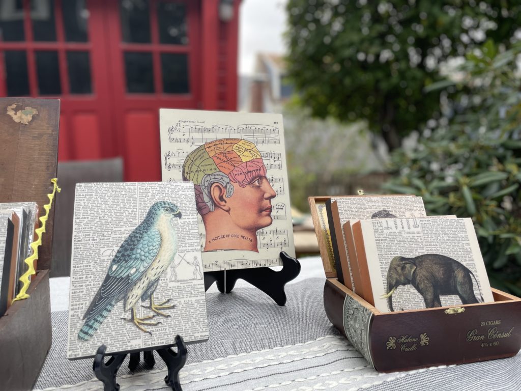 LOCATION: The Eliot School, 24 Eliot Street Mixed media collage aritst inspired by all things vintage. Each collage is unique and made with original sheet music, pages from dictionaries-encyclopedias, and images from clipart and vintage nature books....Amy HITCHCOCK Assorted Collages -